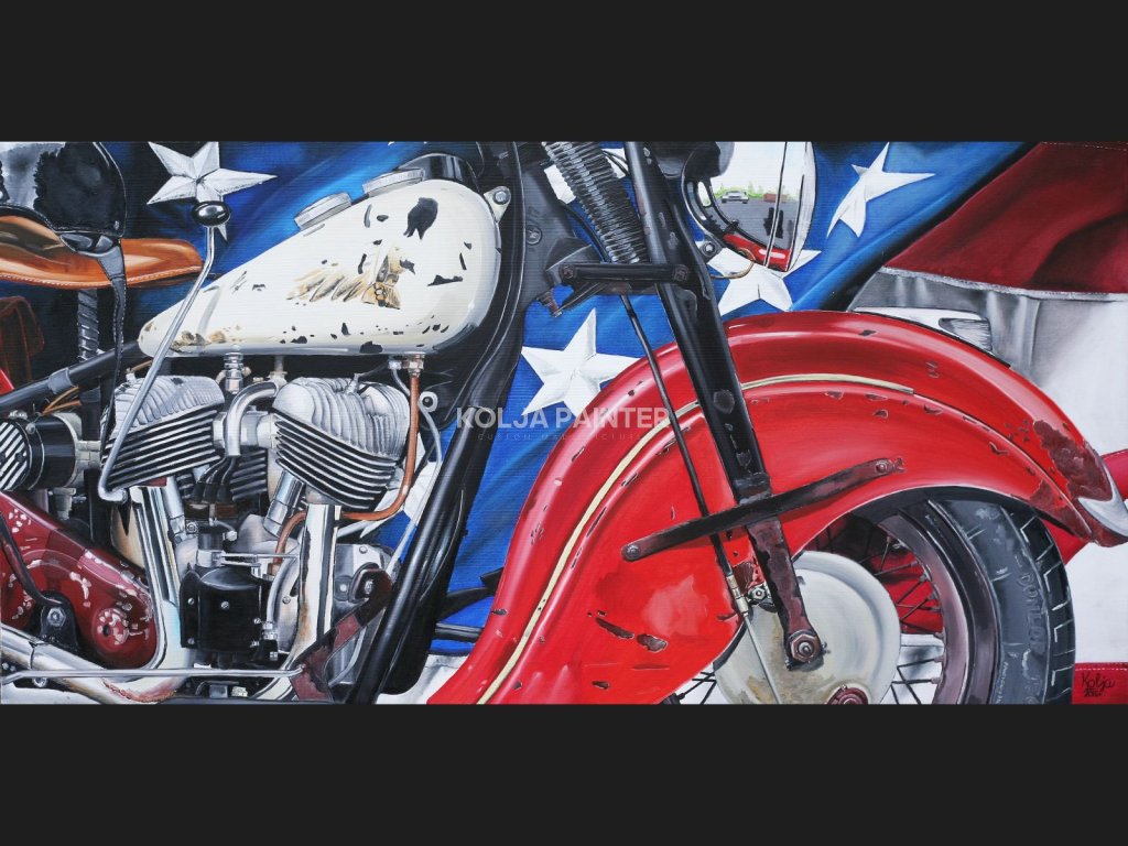 Typická amerika. Indian s vlajkou usa. Co víc může být amerického. Mám to tam rád, tak to maluji. Tenhle obraz visí u soukromého majitele v New Jersey.