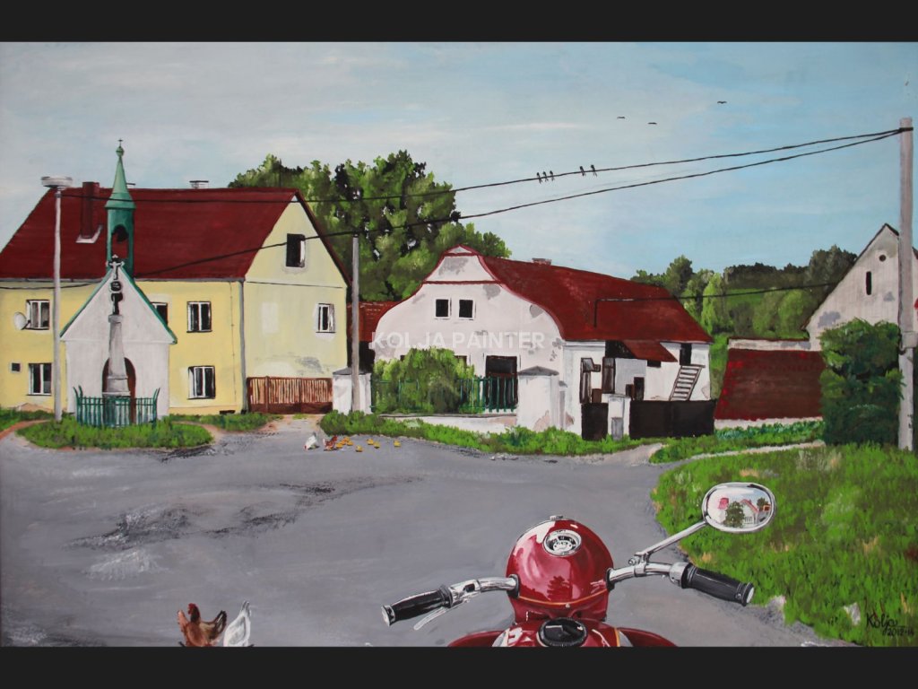 Babínská náves. Obraz pro mojí mamku. Jawička je jen malý doplněk, ale primárně šlo o tu náves.