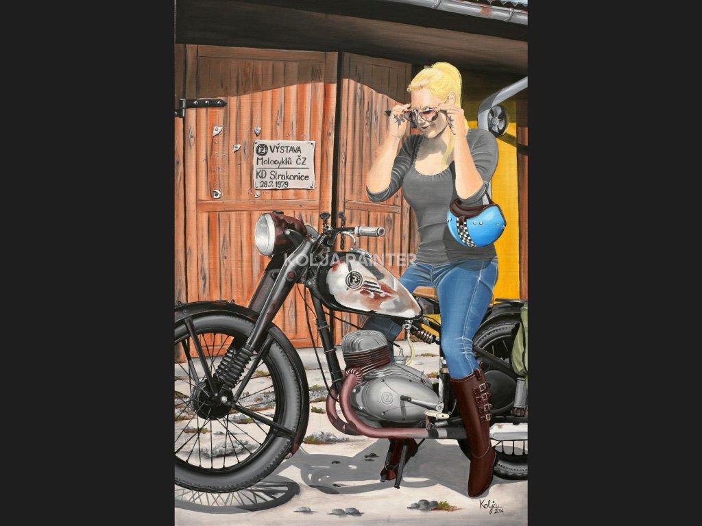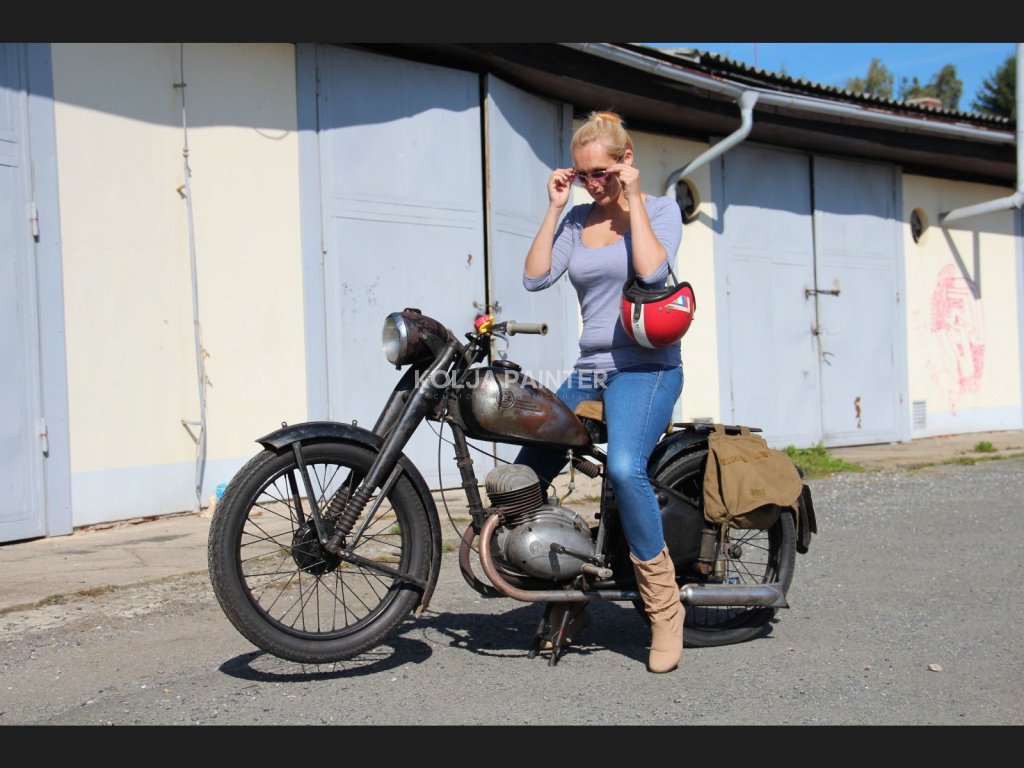 Jedná se o ČZ 150 c mého bráchy, na ní sedí moje žena a v pozadí je naše původní společná garáž v kasárnách v Horažďovicích