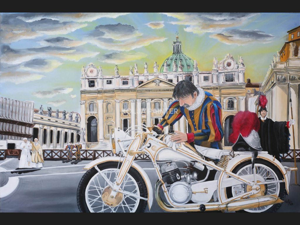 Vatikánka ve Vatikánu. Obraz na objednávku majitele muzea v Konopišti. Pár dní po focení před malbou mu motorku z muzea ukradli. Modelem mi tam stál Hery.